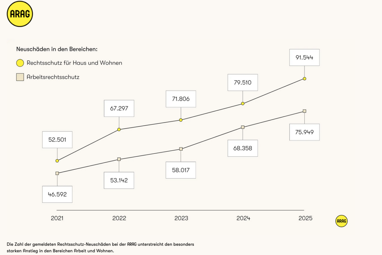 Dass es sich nicht nur um ein Stimmungsbild handelt, zeigen die Schadenzahlen. Vor allem in den zwei Bereichen Arbeit und Wohnen ziehen sie seit Jahren spürbar an. Im Rechtsschutz für Haus und Wohnen steigt die Zahl der gemeldeten Neuschäden von 52.501 Fällen im Jahr 2021 auf 91.544 im Jahr 2025. Das ist ein Plus von rund 74 Prozent in vier Jahren.