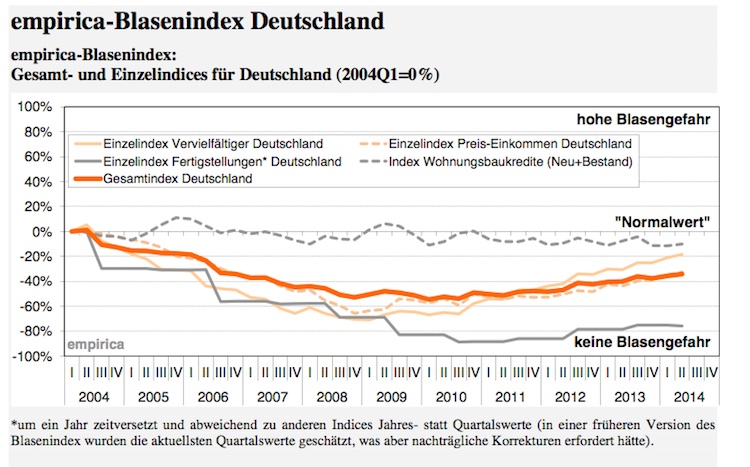Wie das Berliner Researchinstitut Empirica mitteilt, stieg der Blasenindex für den deutschen Immobilienmarkt im zweiten Quartal 2014 weiter an. Das sei jedoch kein Grund zur Sorge.