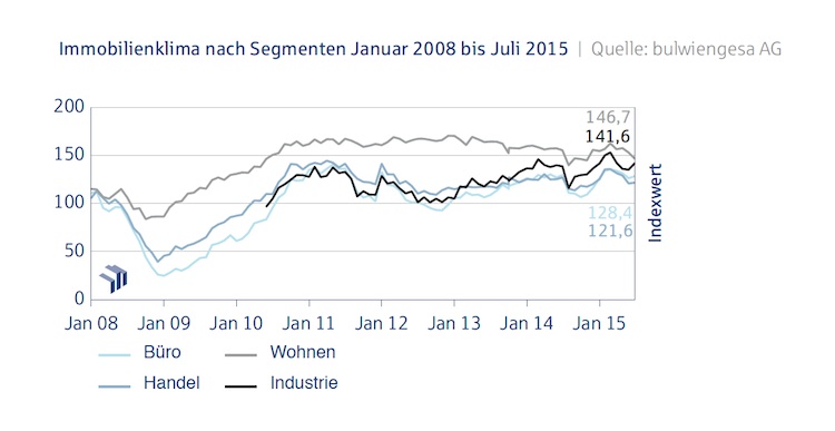 Das Immobilienklima für den Gesamtmarkt rangierte im Juli wie im Juni bei 130 Indexpunkten.