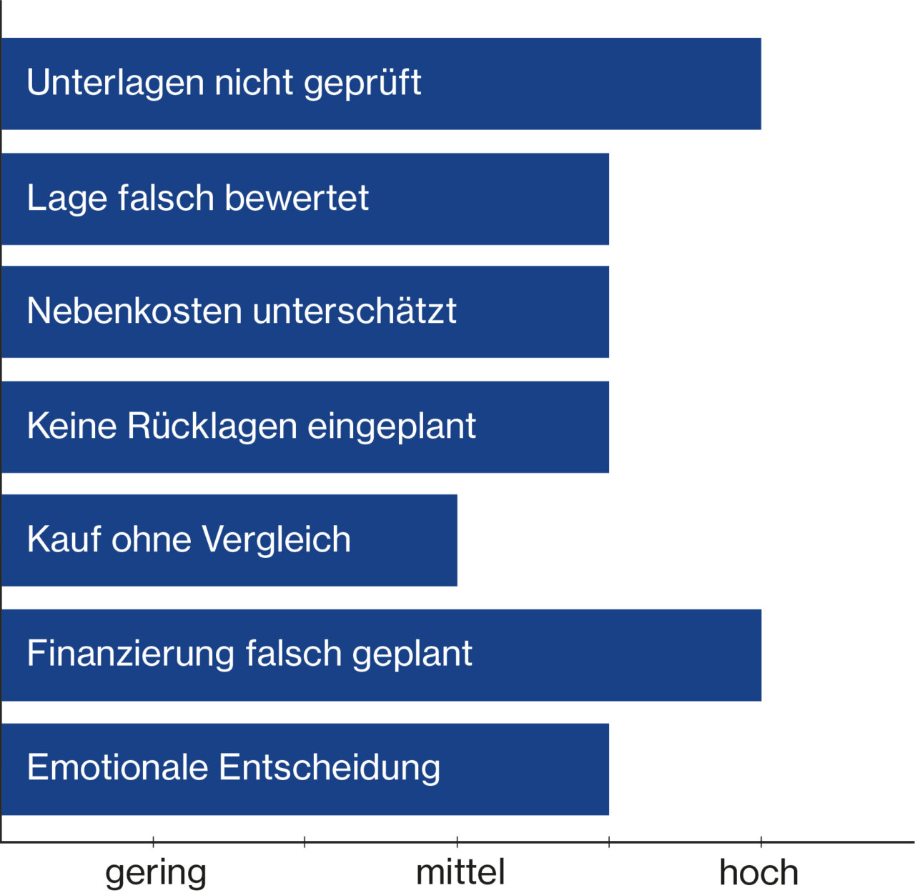 Ein Käufer wollte eine Eigentumswohnung kaufen, weil sie ihm optisch gefiel, ohne die Teilungserklärung und das Protokoll der Eigentümerversammlung zu prüfen. Erst nach dem Kauf stellte sich heraus, dass eine teure Dachsanierung beschlossen war, an deren Kosten er sich beteiligen musste. Hätte er die Unterlagen vorher geprüft oder sich beraten lassen, hätte er den Kaufpreis nachverhandeln oder sich für eine andere Immobilie entscheiden können.