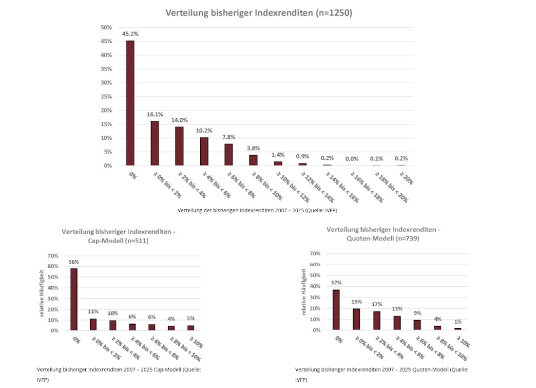 Im Marktvergleich schnitten Modelle mit jährlicher Beteiligungsquote besser ab als klassische Cap-Modelle. Während Quotenmodelle im Durchschnitt etwa 3,7 Prozent erzielten, kamen Cap-Varianten auf rund 2,5 Prozent. Auch bei der Wahl der Indizes zeigten sich Unterschiede. Reine Aktienindizes lieferten mit durchschnittlich rund 3,9 Prozent höhere Ergebnisse als Multi-Asset-Indizes, die im Mittel bei etwa 2,6 Prozent lagen.