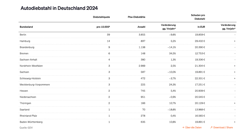 Im Ländervergleich bleibt Berlin die Hochburg des Autodiebstahls. Dort wurden im Jahr 2024 insgesamt 3.855 kaskoversicherte Autos gestohlen. „Berlin ist und bleibt die Hauptstadt der Autodiebe, hier findet mehr als jeder vierte Diebstahl bundesweit statt“, sagt Asmussen.