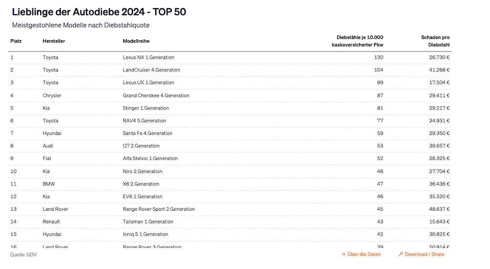 Autodiebe haben es vor allem auf SUVs sowie Fahrzeuge der oberen Mittel- und Oberklasse abgesehen. Besonders auffällig ist die Häufung von Toyota-Modellen. Auf der Liste der zehn am häufigsten gestohlenen Modellreihen belegt der japanische Hersteller gleich vier Plätze. Die Spitze bilden erneut der Toyota Land Cruiser sowie die Lexus-Modelle NX und UX.