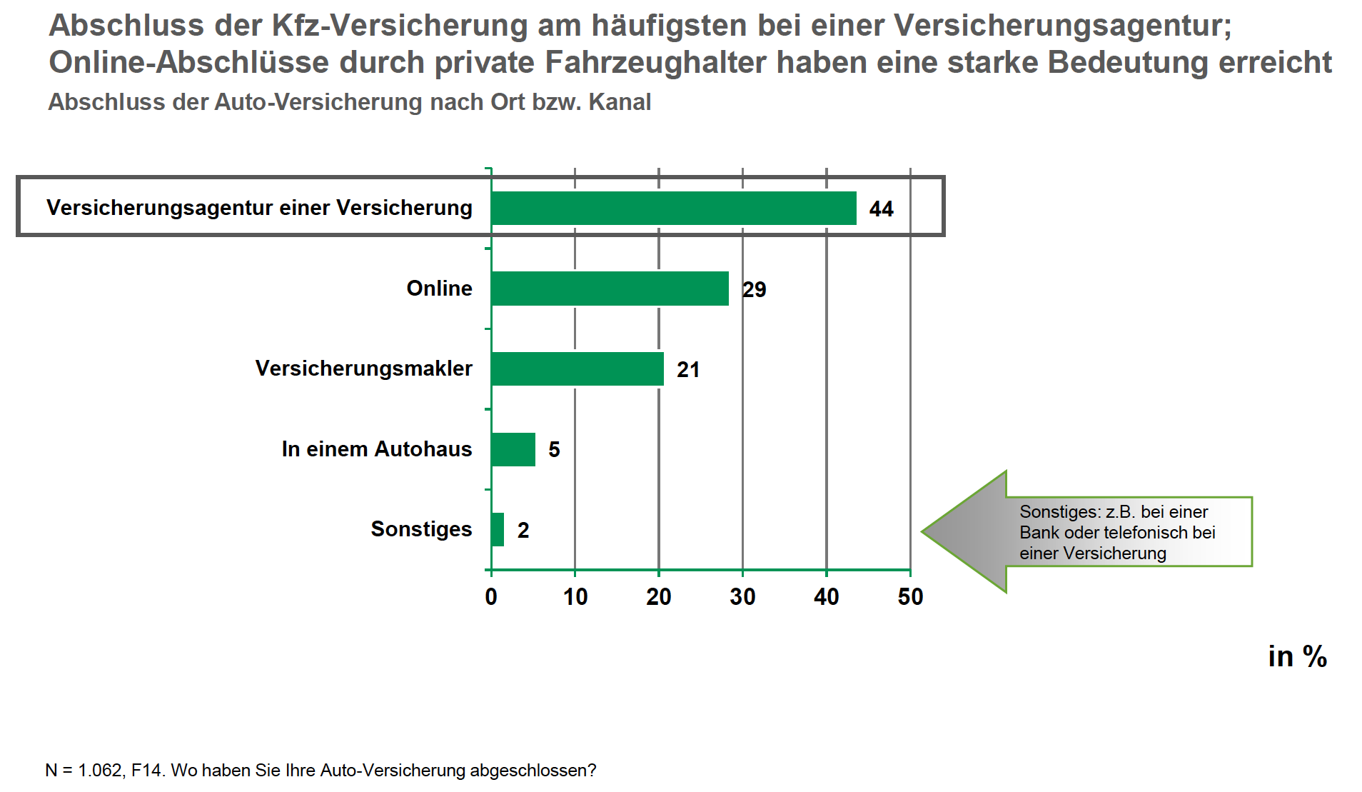 Die Vertriebswege Versicherungsagentur, Online und Makler erreichen zusammen mehr als 90 Prozent der Autokäufer. Für alternative Anbieter bleibt da kaum Platz. So entscheiden sich nur fünf Prozent der Befragten für den Versicherungsabschluss beim Kfz-Händler. Das sind Ergebnisse der Studie „Werkstatt-Services aus der Sicht des Fahrzeughalters“ der Unternehmensberatung HNW Consulting in Zusammenarbeit mit dem IMWF Institut für Management- und Wirtschaftsforschung.