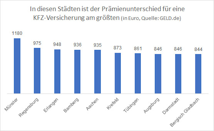 Beim Vergleich der Versicherungsprämien in den jeweiligen Städten habe sich herausgestellt, dass Versicherungsnehmer im westfälischen Münster mit 1.180 Euro jährlich am meisten sparen können, wenn sie vom teuersten zum günstigsten Anbieter wechseln.