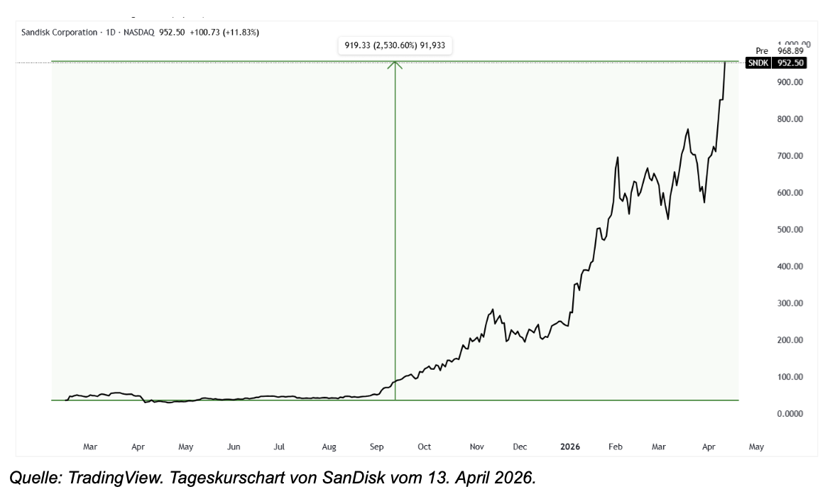 Während die globalen Finanzmärkte im Zuge des US-Israel-Iran-Konflikts unter Druck geraten sind und die Risikobereitschaft der Anleger deutlich nachgelassen hat, zeigt sich ein bemerkenswerter Ausreißer: SanDisk. In einem Umfeld, in dem insbesondere wachstumsorientierte Technologieaktien unter Abgabedruck stehen, hat sich die Aktie in die entgegengesetzte Richtung bewegt. Seit Beginn des Konflikts legte sie um mehr als 50 Prozent zu und verzeichnet auf Jahressicht sogar ein Plus von über 2.500 Prozent¹.