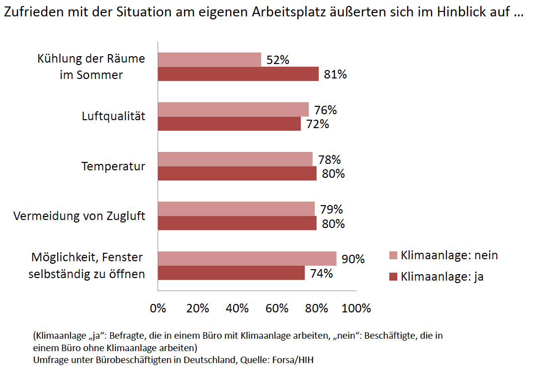 Insgesamt zeigte sich die Mehrheit der von Forsa befragten Bürobeschäftigten mit dem Raumklima ihres Büros zufrieden. Bei den wesentlichen Kriterien Vermeidung von Zugluft, Temperatur, Luftqualität und der Möglichkeit Fenster selbstständig zu öffnen, äußerten sich um die 80 Prozent zufrieden mit dem Raumklima an ihrem Arbeitsplatz. In Bezug auf die Luftqualität herrscht unter den Beschäftigten, die in Büros ohne Klimaanlage arbeiten, sogar eine höhere Zufriedenheit als unter jenen, die in einem Büro mit Klimaanlage arbeiten (76 Prozent gegenüber 72 Prozent). Hinsichtlich des Einzelkriteriums Kühlung der Räume im Sommer (81 Prozent gegenüber 52 Prozent) sowie beim Geräuschpegel (77 Prozent gegenüber 28 Prozent) ist die Zufriedenheit unter den Beschäftigten in klimatisierten Büros höher als bei jenen, die in Räumen tätig sind, in denen diese Technik nicht zur Verfügung steht.