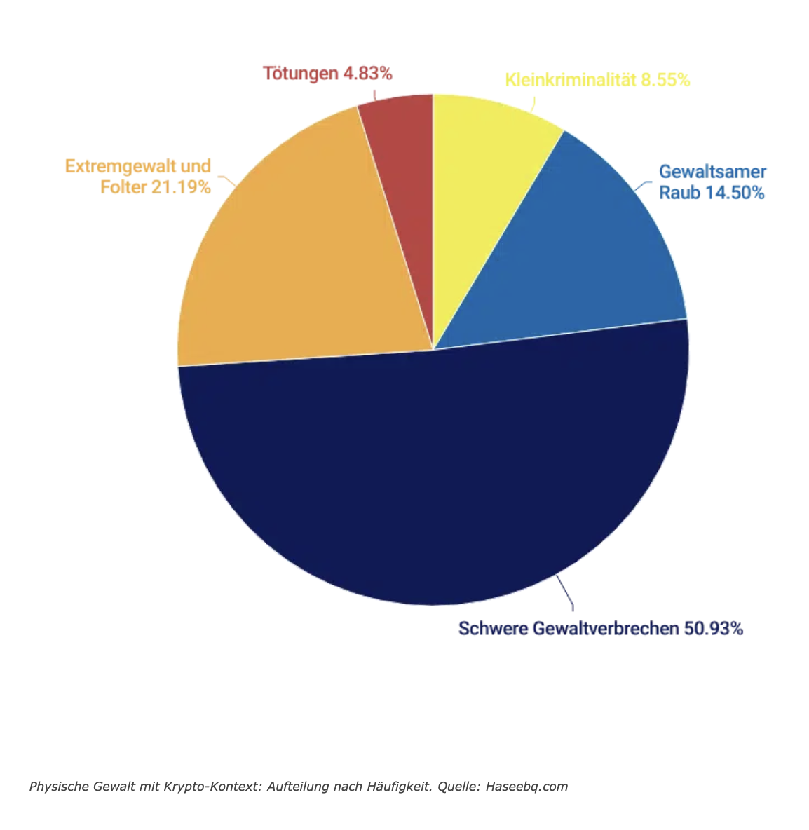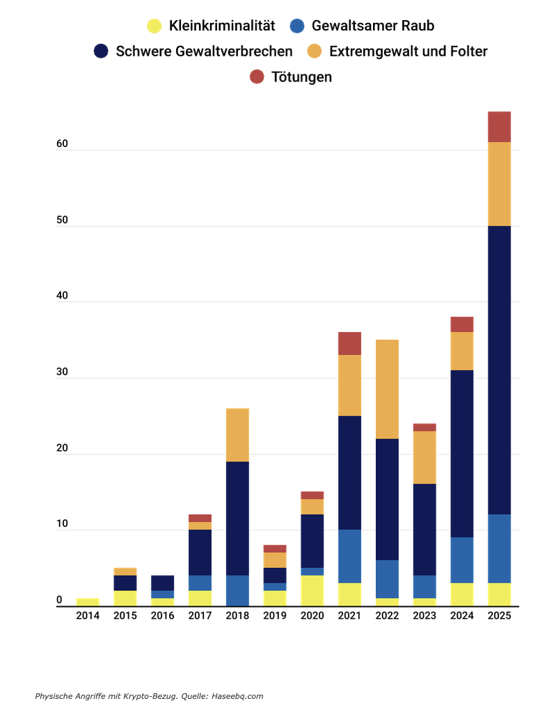 In der Gesamtschau machen schwere Gewaltverbrechen inzwischen rund 51 Prozent aller physischen Gewalttaten im Krypto-Kontext aus. Das Verhältnis hat sich damit deutlich verschoben. Während frühere Berichte meist vereinzelte Vorfälle beschrieben, deutet die aktuelle Datenlage auf ein strukturelles Risiko hin.
