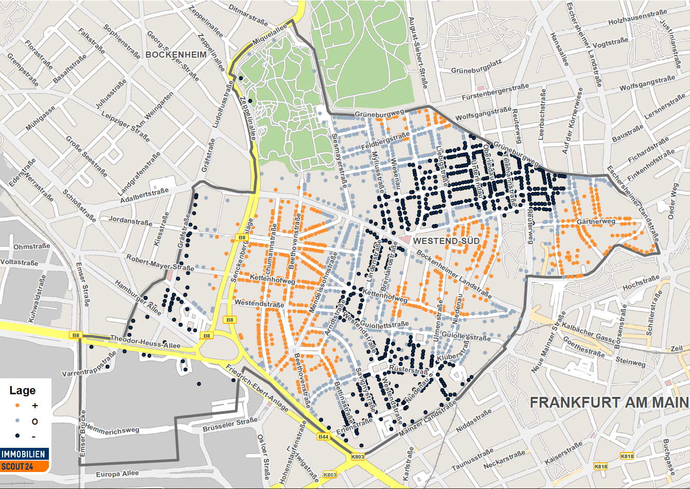 Zu den besten Wohnlagen würden die Beethovenstraße und die Schumacherstraße gehören Auch im östlichen Teil des Westend-Süd, im Gärtnerweg, sowie nördlich und südlich der Bockenheimer Landstraße gebe es gute Lagen. Einfache bis mittlere Lagen würden sich in Richtung Mainzer Landstraße, etwa rund um Savignystraße und Westendstraße finden. (kl)