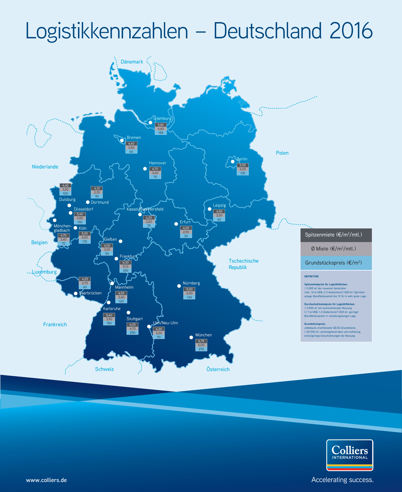 Die Spitzenmieten der Top-Standorte entwickeln sich laut Colliers stabil. München bleibt mit 6,75 Euro pro Quadratmeter der teuerste Standort. Frankfurt belegt mit einer Spitzenmiete von 6,30 Euro Platz zwei.