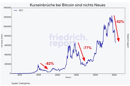 Wenn man die Vierjahreslogik bei Bitcoin ernst nimmt, dann wäre ein möglicher Peak im Herbst 2025 absolut zyklustypisch gewesen und ein darauffolgendes Bärenjahr 2026 ebenso. Ein Rückgang von 50 Prozent liegt historisch sogar noch unter früheren Durchschnittskorrekturen. Es könnte allerdings sein, dass das Schlimmste schon hinter uns liegt und aufgrund der vielen neuen institutionellen Investoren der Bärenmarkt weniger heftig ausfallen wird als früher.