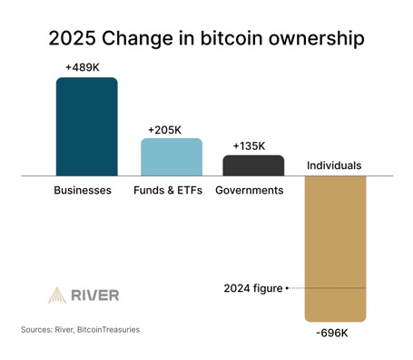 Wer allerdings schon länger bei Bitcoin dabei ist weiß: Das sind alles Zeichen, dass es sich auch diesmal wieder erholen wird. Bitcoin ist in der klassischen Finanzwelt angekommen und verhält sich zunehmend auch wie ein solches Asset. Die folgende Abbildung von River verdeutlicht, dass wir seit 2025 einen großen Abfluss von Bitcoin bei Privatanlegern gesehen haben. Gleichzeitig haben Fonds, ETFs und vor allem Unternehmen stark aufgestockt.