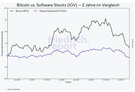 Der gleichzeitige Kursrückgang von Bitcoin und Software-Aktien ist also kein Beweis dafür, dass Bitcoin schwach ist. Es ist ein Beweis dafür, dass der Markt gerade einen Fehler macht. Und Fehler des Marktes werden früher oder später korrigiert.
