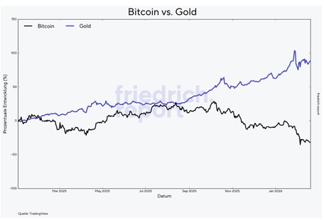 Während die Edelmetalle Gold und Silber in den letzten Monaten fantastische Kursgewinne gesehen haben, hat sich das digitale Gold entgegengesetzt entwickelt. Statt Gold zu folgen, hat der Bitcoin seit seinem Hoch im Oktober 2025 zwischenzeitlich mehr als 50 Prozent verloren. Der folgende Chart verdeutlicht, wie gegensätzlich Gold und Bitcoin sich in den letzten Monaten entwickelt haben.