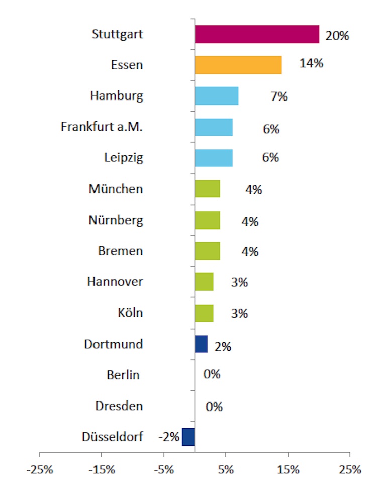 Den größten Mietanstieg gegenüber dem Vorjahr erlebte Stuttgart: Das aktuelle Plus von 20 Prozent auf 12,70 Euro wird laut Immowelt zum Teil verursacht durch eine große Anzahl von neu gebauten und nun konzentriert vermarkteten Wohnungen im oberen Preissegment.