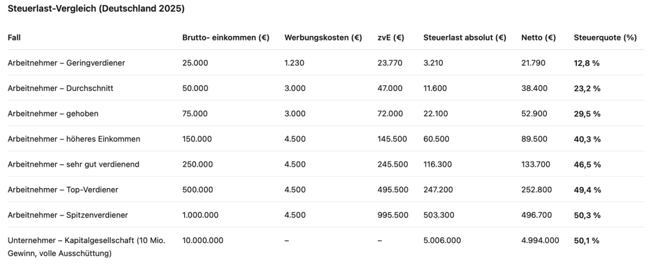 Um den Mythos sauber zu prüfen, habe ich Modellrechnungen erstellt. Sie zeigen die Steuerlast für Arbeitnehmer in verschiedenen Einkommensstufen und für einen Milliardär, dessen Unternehmen 10 Millionen Euro Gewinn erzielt und vollständig ausschüttet.