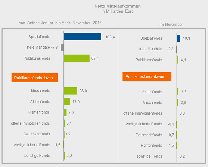 Seit Januar letzten Jahres summiert sich das Neugeschäft in Publikums- und Spezialfonds auf insgesamt 171 Milliarden Euro. Die Fondsbranche verwaltete Ende November ein Vermögen von über 2,6 Billionen Euro. Davon entfallen auf Spezialfonds 1,4 Billionen Euro, auf Publikumsfonds 901 Milliarden Euro und 357 Milliarden Euro auf freie Mandate.