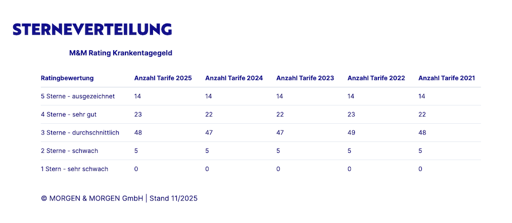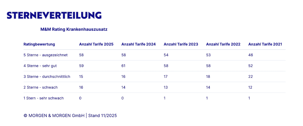 Das Ergebnis: 58 Tarife erhalten weiterhin die Höchstbewertung von fünf Sternen. Die Vier-Sterne-Kategorie verzeichnet einen leichten Rückgang auf 59 Tarife, zwei weniger als im Vorjahr. Drei-Sterne-Tarife sinken auf 15, während die Zwei-Sterne-Gruppe auf 16 Tarife wächst. Kein Tarif wird mit nur einem Stern bewertet. Insgesamt sieht Morgen & Morgen darin keine Trendwende, sondern normale Schwankungen infolge von Produktanpassungen.