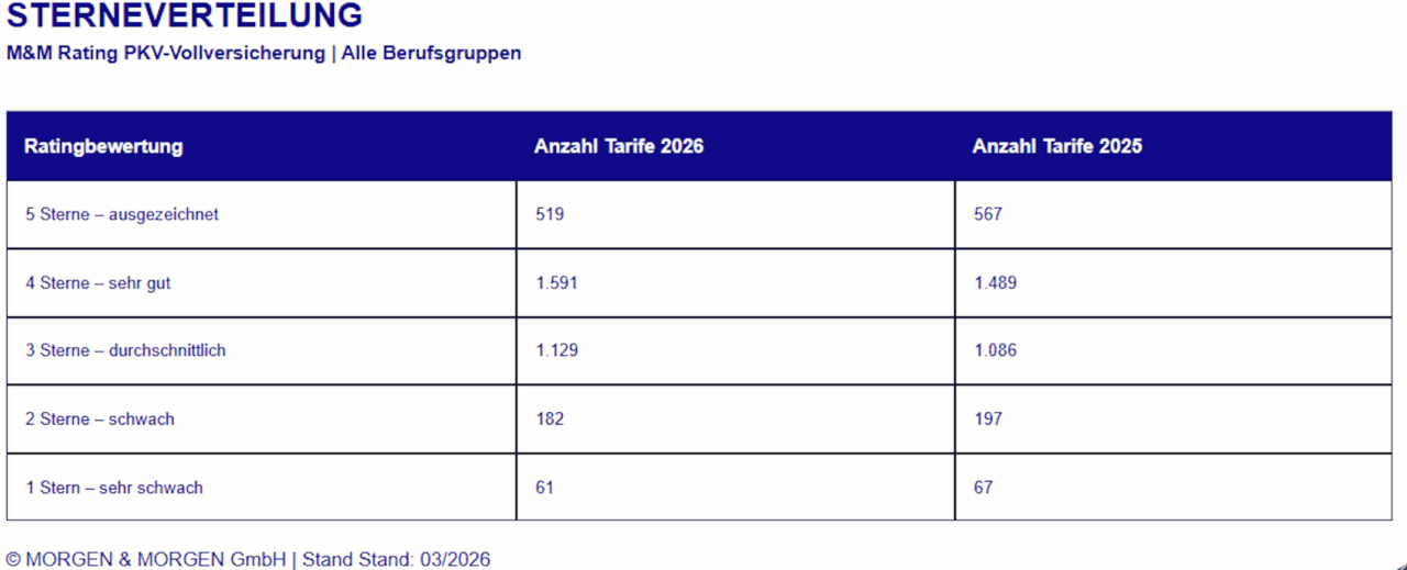 Der spannendere Teil für den Vertrieb spielt sich jedoch unterhalb der Spitzentarife ab. Im Segment für alle PKV-Berechtigten sowie für Gruppen wie Selbständige oder Ärzte wurden 3.482 Tarifkombinationen bewertet. 519 Tarife erreichen die Höchstnote von fünf Sternen – weniger als im Vorjahr. Das liegt laut Morgen & Morgen allerdings nicht an einer schlechteren Qualität, sondern an weniger Tarifkombinationen infolge von Anpassungen und Fusionen.