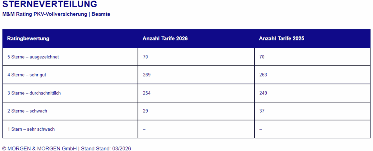 Bei den Beamtentarifen zeigt sich ein ruhigeres Bild. Die Qualität bleibt stabil, die Verteilung verschiebt sich leicht nach oben. Von 622 Tarifkombinationen erhalten weiterhin 70 die Bestnote.