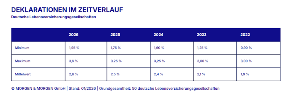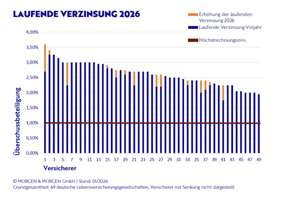 Der positive Trend bei den Überschussbeteiligungen in der Lebensversicherung setzt sich 2026 fort. Das unabhängige Analysehaus Morgen & Morgen hat dazu die Deklarationen von 50 deutschen Lebensversicherern ausgewertet und deckt damit nahezu den gesamten Markt ab. Zwar erhöhen weniger Anbieter ihre Überschüsse als in den Vorjahren, insgesamt steigt das Niveau jedoch weiter an.