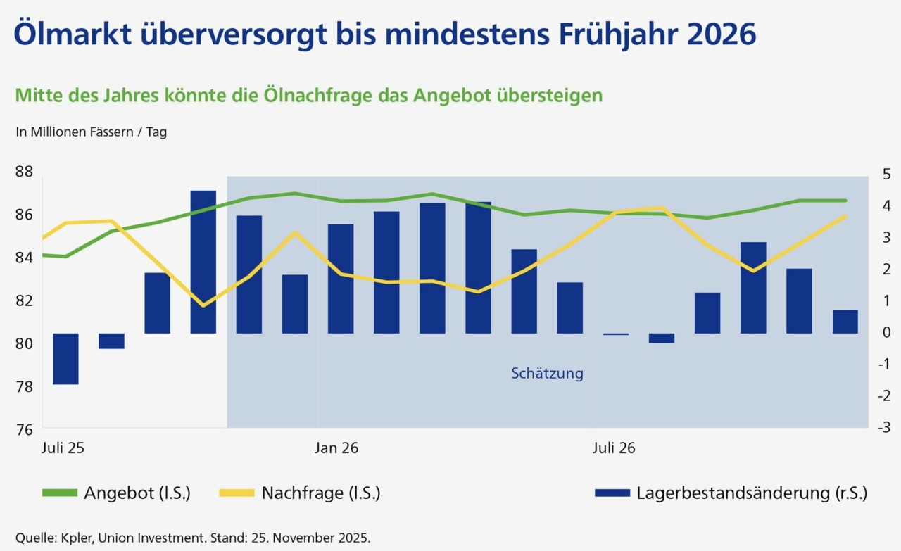 Rückblickend war 2025 kein gutes Jahr für Energierohstoffe. Der Ölpreis gab deutlich nach, von 80 US-Dollar pro Fass der Sorte Brent auf etwa 60 US-Dollar Ende November. Diese Schwäche wird auch nicht so schnell verfliegen, denn die Produktionsüberschüsse und die hohe Lagerhaltung der vergangenen Monate werden wir auch im ersten Halbjahr 2026 noch sehen. Der Markt ist mit Öl überversorgt, so dass viel mehr als 60 US-Dollar pro Fass bis zum Frühsommer kaum zu erwarten sind. Geschuldet ist das neben dem üppigen Angebot auch der saisonal bedingt schwächelnden Nachfrage.