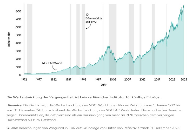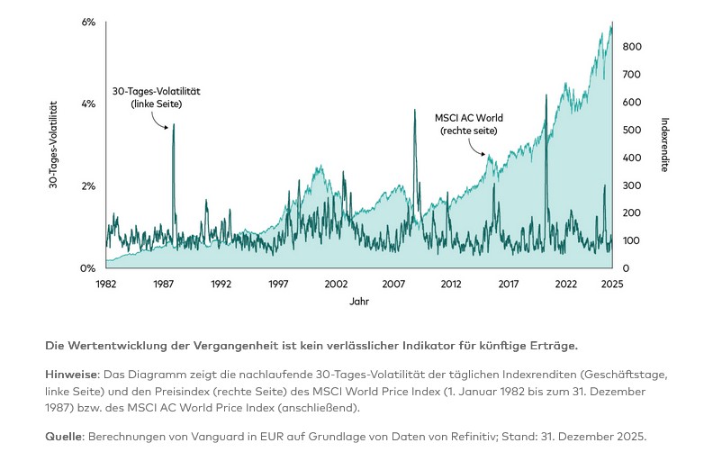 Kurzfristige Volatilität ist ein normaler Bestandteil jeden Anlegerlebens. Die Kurse an den Aktienmärkten sind langfristig gestiegen – trotz volatiler Phasen, die häufig mit Kursverlusten einhergingen (siehe Grafik 1). Auf eine 30-Tages-Volatilität folgt in kommenden Jahren immer eine Erhöhung um den Preisindex, wie anhand des MSCI AC World sichtbar ist. Kursrückgänge sind aber kein seltenes Phänomen. Die meisten Anleger werden im Laufe ihres Lebens auch mehr als nur einen Abschwung überstehen. Bärenmärkte und Kurskorrekturen sind Teil des Anlegerlebens; was zählt, sind langfristige Ergebnisse.