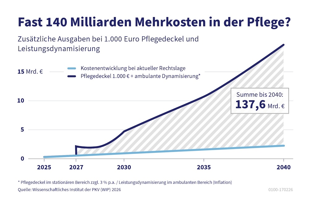 Wird der monatliche Pflegedeckel auf 1.000 Euro festgesetzt, steigt die errechnete Mehrbelastung auf 137,6 Milliarden Euro. Das entspräche 99 Prozent der bis 2040 prognostizierten Zusatzkosten der Rentenreform.