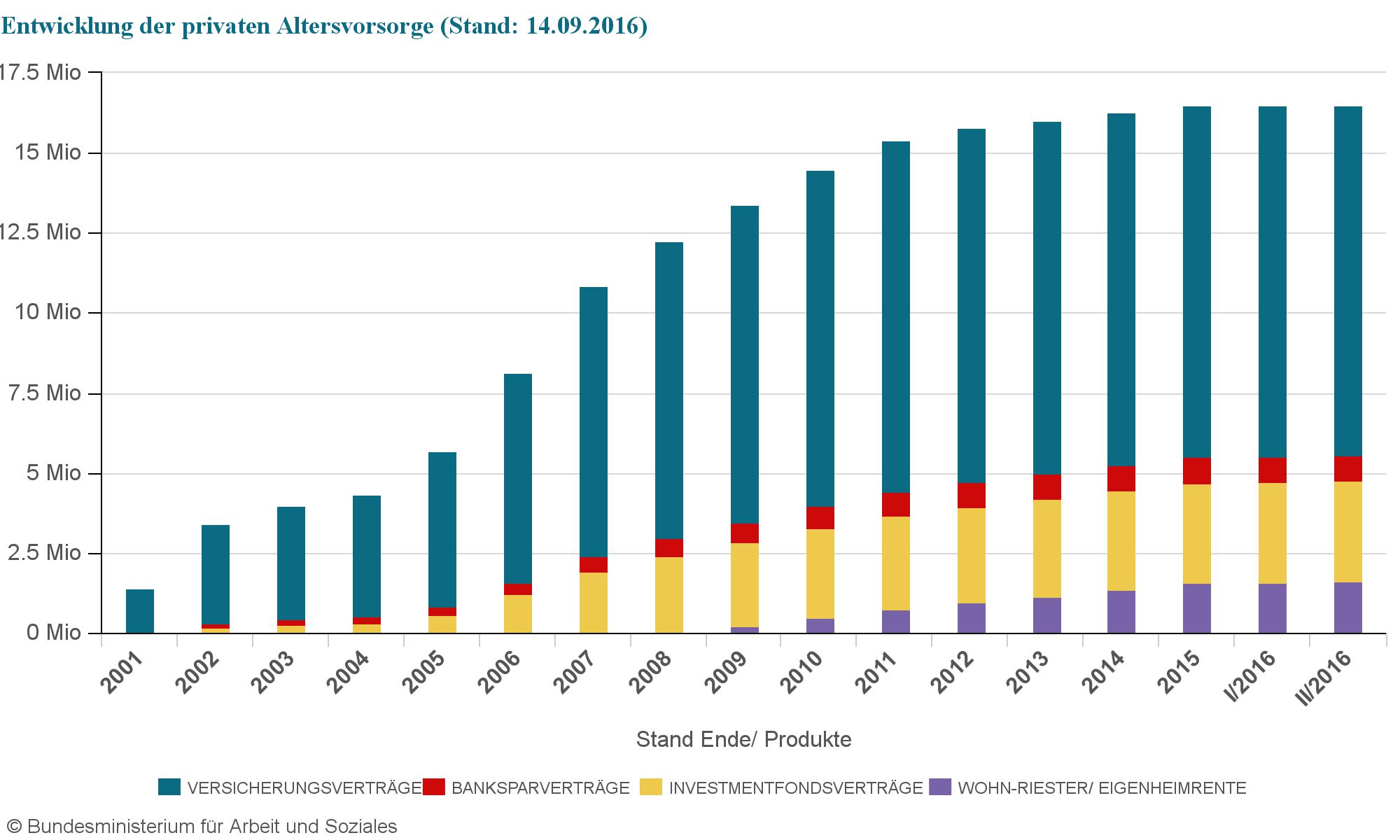 Der Bestand an Riester-Verträgen in Deutschland ist zwischen April und Juni 2016 um gut 10.000 auf über 16,492 Millionen gestiegen. Wie die aktuellen Zahlen des Bundesministeriums für Arbeit und Soziales (BMAS) zeigen, entwickelte sich vor allem die Wohn-Riester-Variante positiv, die Riester-Versicherungen bleiben hingegen das Sorgenkind.