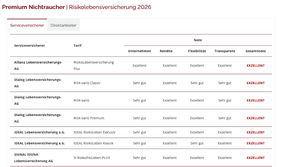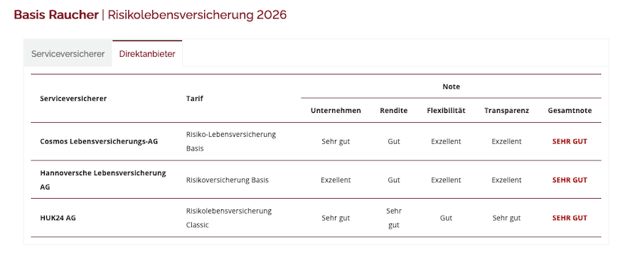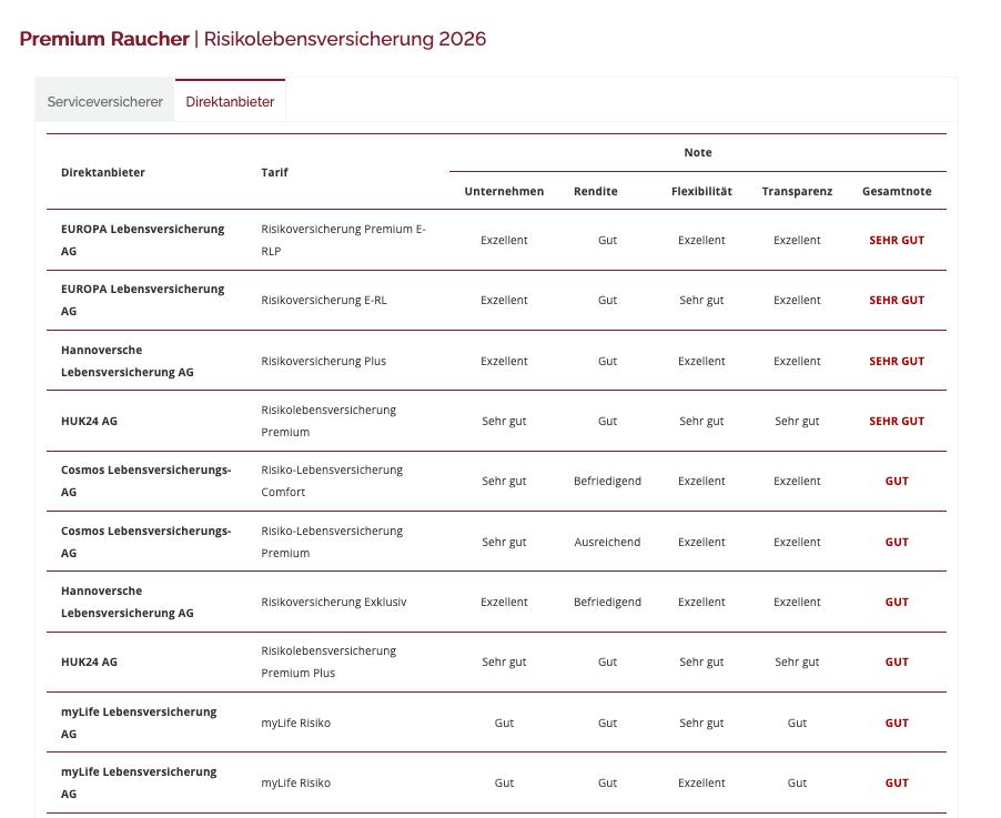 Die Beitragsberechnungen im Rating basieren auf Musterfällen mit einer konstanten Versicherungssumme von 150.000 Euro für Versicherte im Alter von 30 oder 40 Jahren. Dabei wird zwischen Nichtrauchern und Rauchern sowie unterschiedlichen Berufsgruppen unterschieden.
