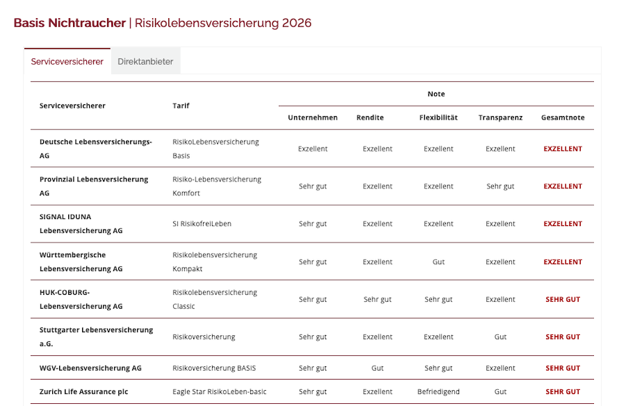 Das Rating unterscheidet zwischen zwei Tarifkategorien. Basistarife sichern ausschließlich das Todesfallrisiko ab. Premiumtarife enthalten zusätzlich Optionen, etwa Leistungen bei schwerer Krankheit oder Möglichkeiten zur späteren Erhöhung der Versicherungssumme ohne erneute Gesundheitsprüfung.
