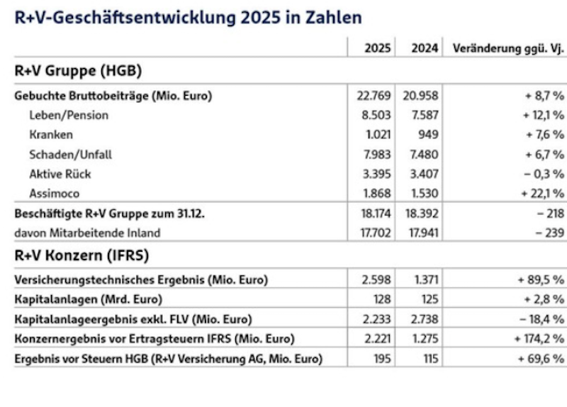 Die Beitragseinnahmen der R+V erhöhten sich 2025 um 8,7 Prozent auf 22,8 Milliarden Euro. Das inländische Erstversicherungsgeschäft wuchs um 9,3 Prozent auf 17,5 Milliarden Euro. Besonders dynamisch entwickelte sich dabei die Lebens- und Pensionsversicherung mit einem Plus von 12,1 Prozent auf 8,5 Milliarden Euro.
