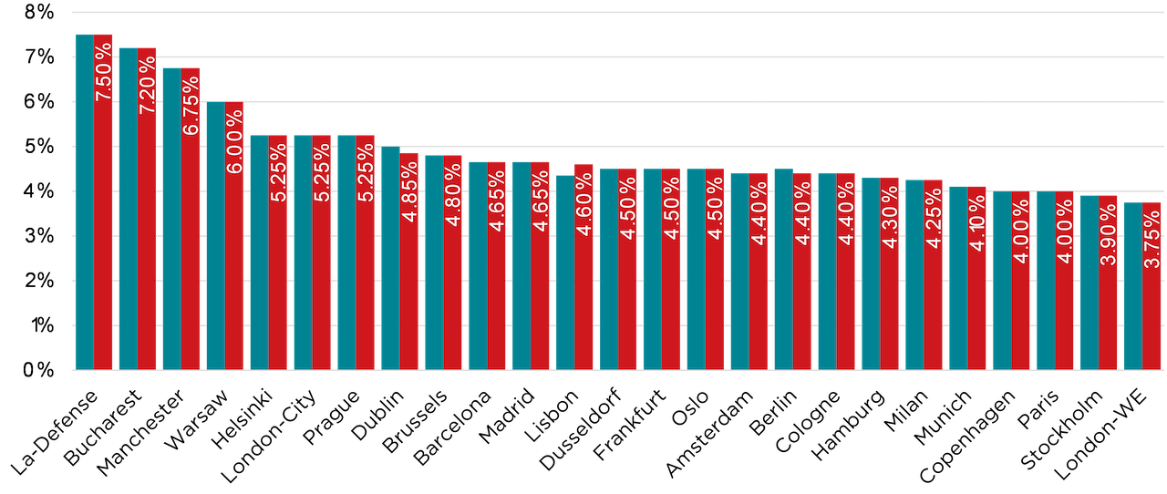Die Zahl der Büroinvestitionen über 50 Millionen Euro ist im Vergleich zum Vorjahr um 43 Prozent gestiegen, da Investoren zunehmend bereit sind, größere Transaktionen zu tätigen, so der internationale Immobilienberater. Die Renditen für erstklassige Büroimmobilien in Europa, also das Verhältnis von Jahresmiete zu Kaufpreis, blieben laut Savills stabil bei durchschnittlich 4,87 Prozent.