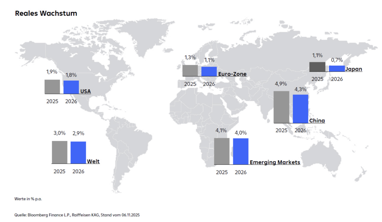 Emerging Markets Gesamtmarkt: Aktien und Anleihen der Schwellenländer (Emerging Markets) schnitten zuletzt überdurchschnittlich ab. Die Region hat auch den höchsten Prozentwert, was die Wachstumsvorhersage für 2026 angeht (siehe Grafik unten). Positiv, was den Ausblick angeht, auch: Auseinandersetzungen zwischen den USA und China scheinen zumindest für die kommenden 6 bis 12 Monate kein akutes Thema mehr zu werden.