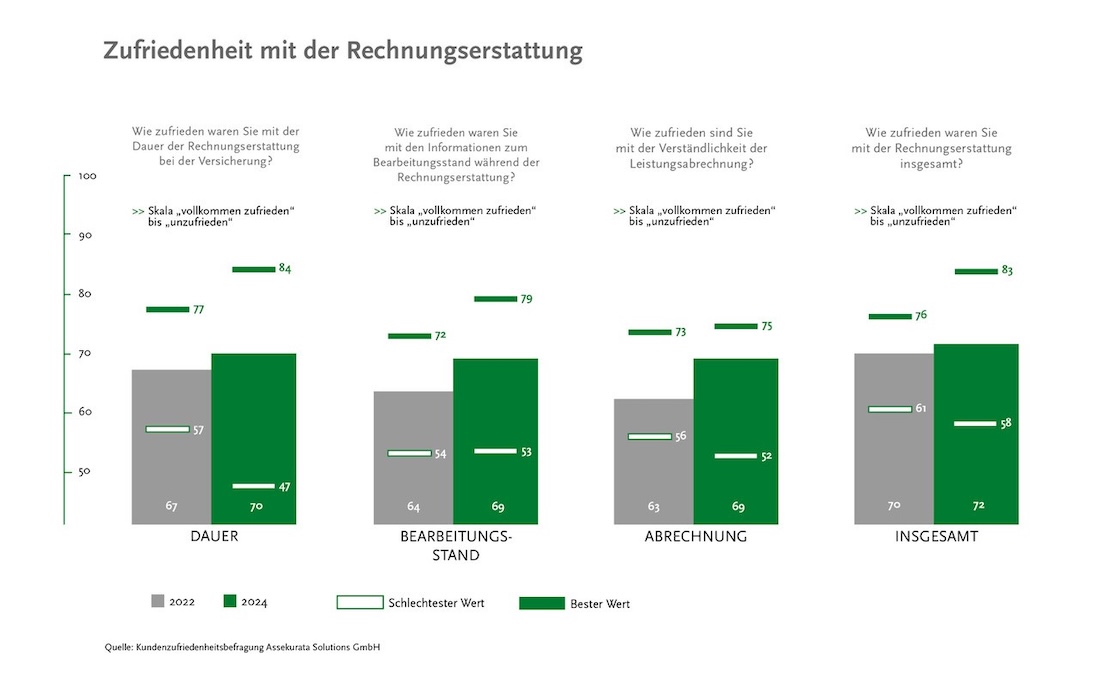 Auch bei der Abwicklung von Rechnungen wurden Fortschritte gemessen. Im Vergleich zu 2022 bewerteten die Kunden die Rechnungserstattung insgesamt um zwei Punkte besser. Vor allem Bearbeitungsdauer (+3 Punkte), Transparenz zum Bearbeitungsstand (+5 Punkte) und Verständlichkeit der Abrechnung (+6 Punkte) legten zu.