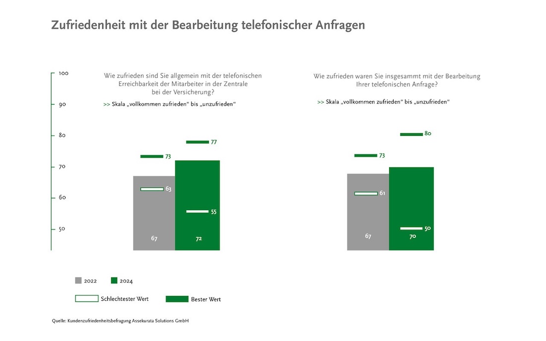 Besonders im direkten Kundenkontakt konnte die PKV zulegen. Versicherte gaben an, ihre Anbieter besser erreichen zu können und kompetentere Auskünfte zu erhalten als noch 2022. Im Schnitt stieg die Zufriedenheit mit der telefonischen Erreichbarkeit um fünf Punkte, die Qualität der Auskünfte um drei Punkte. Laut Assekurata sticht die Universa bei der Erreichbarkeit hervor, während die Nürnberger bei der Bearbeitung von Anfragen vorne liegt.