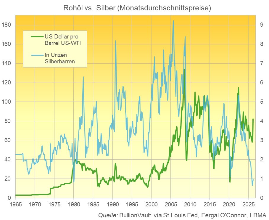 Nach Angaben von BullionVault erreicht oder übertrifft der Silberpreis auf Monatsdurchschnittsbasis seit der Zeit vor Weihnachten den Preis für US-Rohöl. Damit entsteht eine Konstellation, die zuvor nur einmal beobachtet wurde.