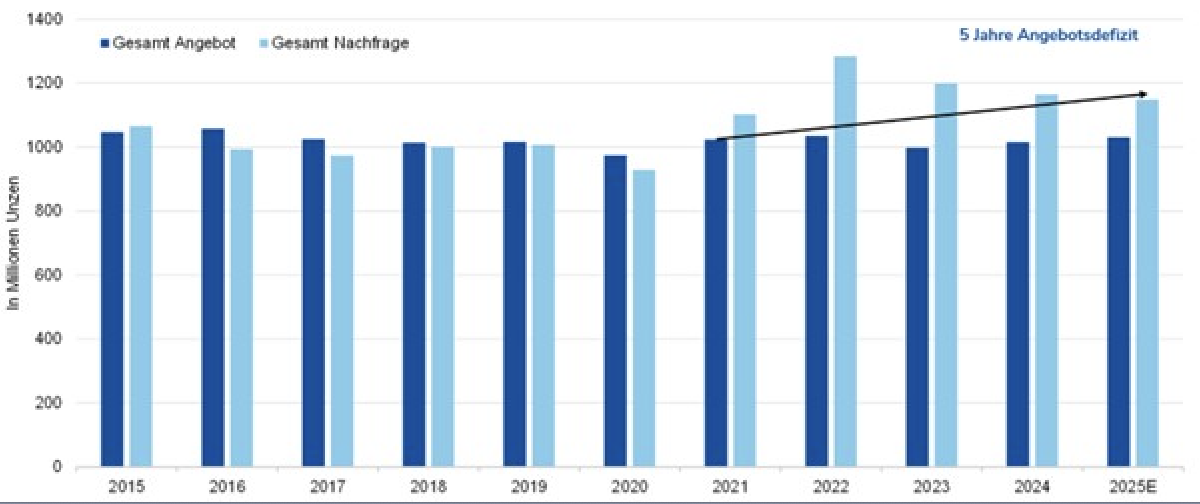 Zusätzlich zu dem Primärangebot werden knapp 200 Millionen Unzen pro Jahr aus Recycling gewonnen. In Summe bleibt jedoch ein Nachfrage-/Angebotsverhältnis, welches die vergangenen Jahre von einem Defizit geprägt war.