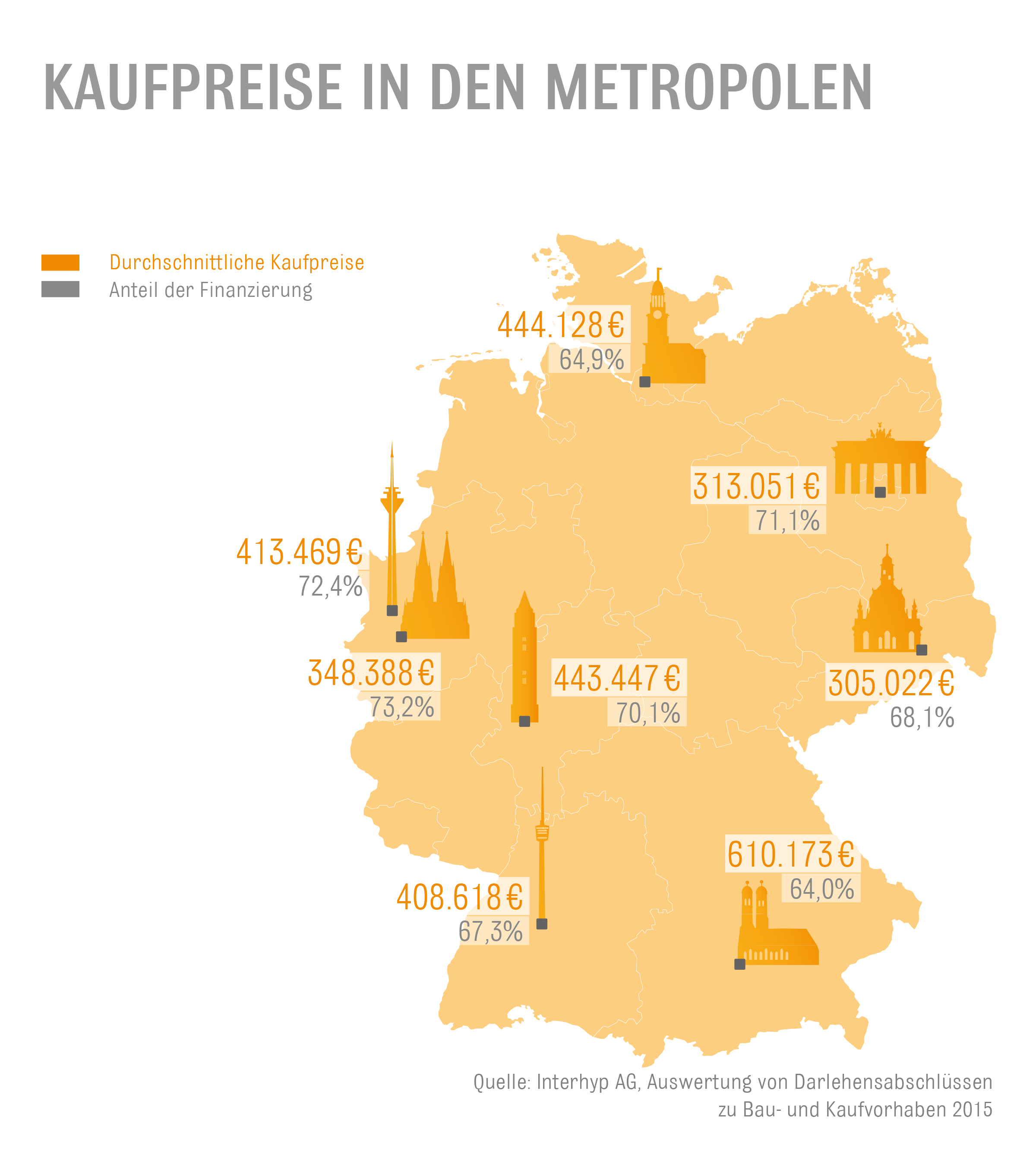 Ausgewertet wurden bundesweit mehr als 180.000 Darlehensabschlüssen für Bau- und Kaufvorhaben von 2010 bis 2015. In den Großstädten, wo die Immobilienpreise besonders stark gestiegen seien, sei der Anteil der Finanzierung am Kaufpreis oft niedriger als im bundesweiten Durchschnitt.