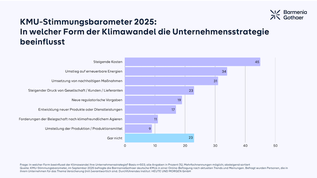 Bei 45 Prozent der befragten Unternehmen schlägt sich der Klimawandel vor allem in gestiegenen Kosten nieder. Darüber hinaus nennen 34 Prozent den Umstieg auf erneuerbare Energien als relevanten Einflussfaktor, 31 Prozent verweisen auf die Umsetzung nachhaltiger Maßnahmen.