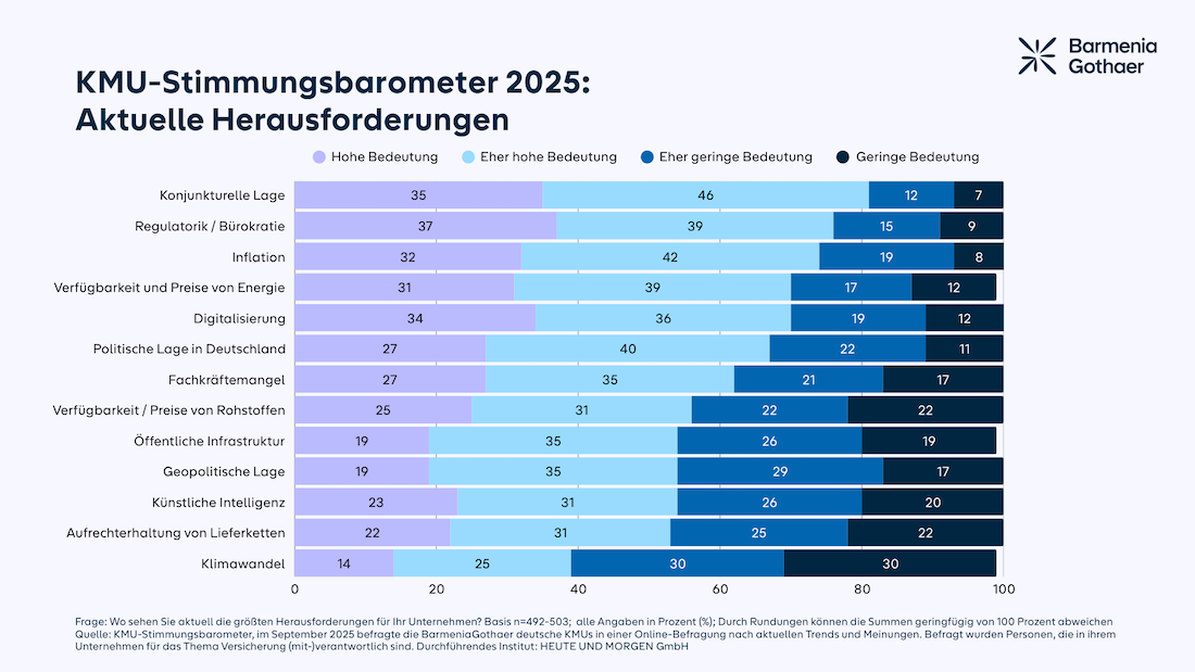 Eine angespannte wirtschaftliche Lage prägt derzeit den Alltag vieler kleiner und mittlerer Unternehmen. Laut dem aktuellen KMU-Stimmungsbarometer der BarmeniaGothaer sehen sich 81 Prozent der befragten Unternehmen mit einer schwachen Konjunktur konfrontiert, 76 Prozent nennen Regulatorik und Bürokratie als zentrale Belastungsfaktoren.