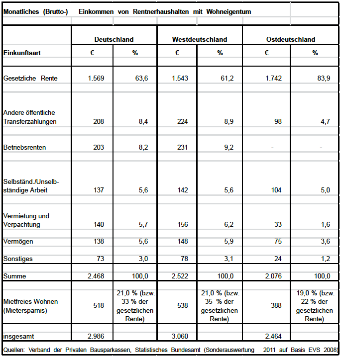 In Westdeutschland betrage die Ersparnis bei miet- und schuldenfreiem Wohnen im Schnitt 538 Euro. Das bedeute 35 Prozent der gesetzlichen Rente, die hier 1.543 Euro ausmache. In Ostdeutschland seien es, so die Bausparkassen, 388 Euro beziehungsweise 22 Prozent der höheren gesetzlichen Rente von 1.742 Euro.