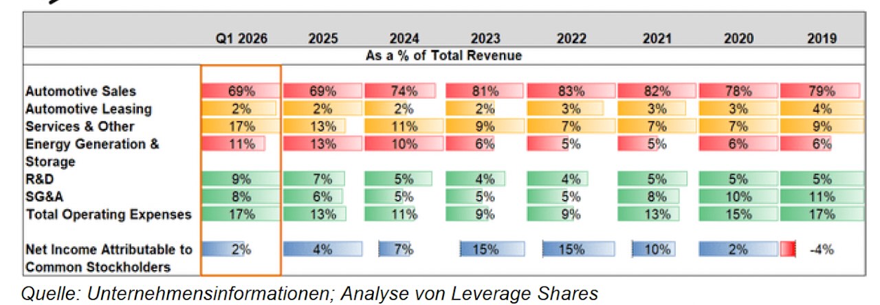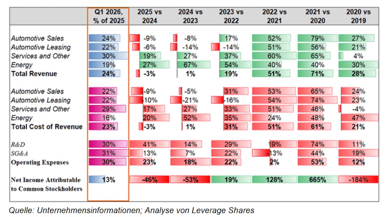 Die Veröffentlichung der Ergebnisse für das erste Quartal des Geschäftsjahres 2026 der von Elon Musk geführten Tesla, Inc. nach Börsenschluss am 22. April konnte den Abwärtstrend der Aktie nicht unmittelbar umkehren. Am Tag vor der Veröffentlichung lag das Papier im Vergleich zum Jahresbeginn bereits mit 14 Prozent im Minus. Am Tag der Bekanntgabe stagnierte der Kurs und gab im Anschluss um weitere 3,6 Prozent nach. Dennoch gibt es für langjährige Tesla-Optimisten einen gewissen Trost unter Vorbehalt: Die frühen Trends im Geschäftsjahr 2026 – rein bezogen auf die Bilanzpositionen – deuten darauf hin, dass das Jahr – bestenfalls – die Trends der letzten zwei Geschäftsjahre widerspiegeln wird, ohne dass sofortige Anzeichen einer Verschlechterung erkennbar sind.