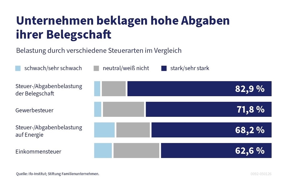 Besonders deutlich fällt die Kritik an der Belastung der Belegschaften aus. In einer Umfrage geben 82,9 Prozent der Unternehmen an, die Steuer- und Abgabenlast der Beschäftigten als stark oder sehr stark belastend zu empfinden. Auch die Gewerbesteuer sowie die Abgaben auf Energie werden von einer großen Mehrheit kritisch beurteilt.