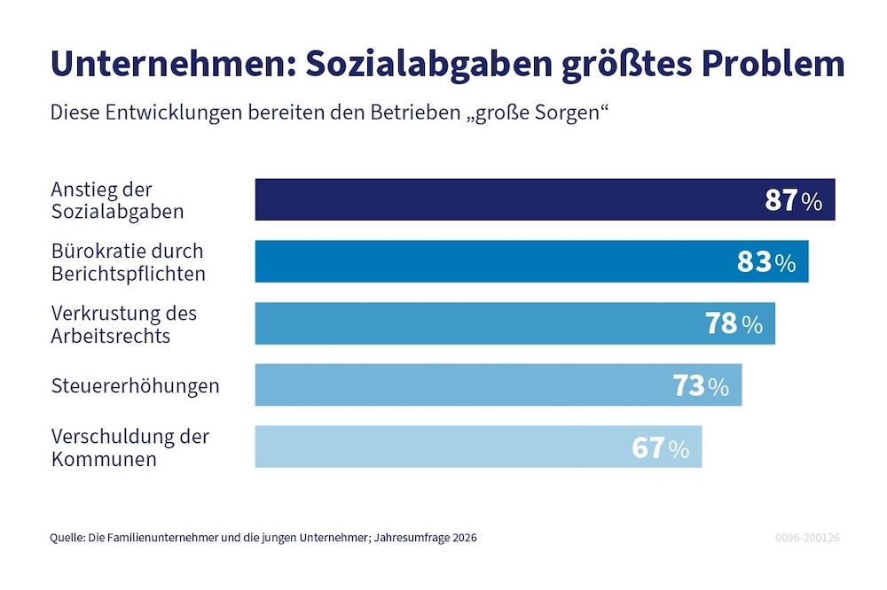 Laut einer Umfrage des Verbands Die Familienunternehmer bereitet der Anstieg der Sozialabgaben 87 Prozent der Betriebe große Sorgen. Damit lösen die Lohnzusatzkosten die Bürokratielast durch Berichtspflichten ab, die im Vorjahr noch als größtes Problem genannt wurde. Auch steigende Anforderungen im Arbeitsrecht, Steuererhöhungen und die Verschuldung der Kommunen werden von einer Mehrheit der Unternehmen kritisch gesehen.