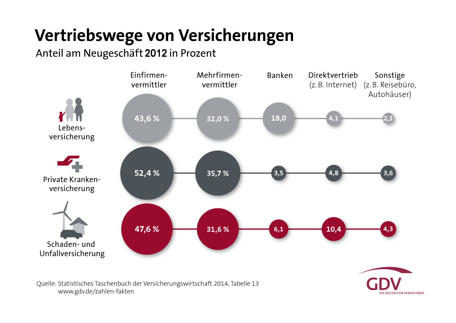 Der Großteil des Leben-Neugeschäfts wird weiterhin von Einfirmenvermittler bestritten. Sie erreichten 2012 einen Marktanteil von rund 44 Prozent. Dabei zeigt sich, dass deren Anteil am Gesamtvertrieb über die Jahre relativ konstant geblieben ist. Leichte Zuwächse erzielte der Direktvertrieb, Einbußen musste hingegen der Bankvertrieb hinnehmen.