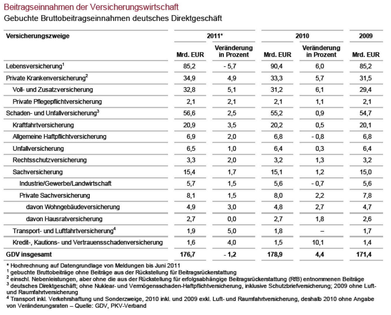 Der Gesamtverband der Deutschen Versicherungswirtschaft (GDV) teilte mit, dass die Branche 2011 mit einen Beitragsrückgang von 1,2 Prozent auf rund 177 Milliarden Euro rechnen muss. In der Lebensversicherung beträgt das Minus 5,7 Prozent.