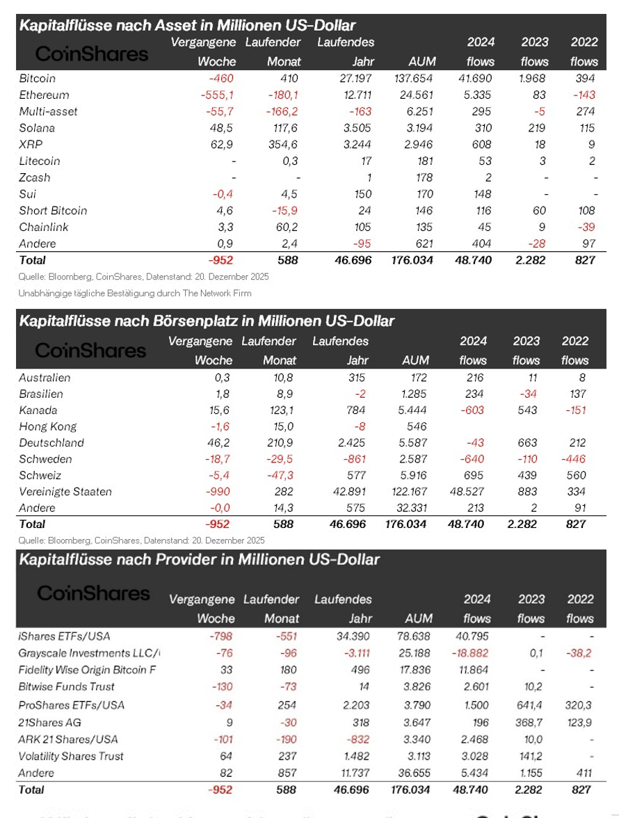 Selektive Stärke zeigten dagegen einzelne Altcoins. Solana und XRP stießen weiterhin auf Nachfrage und erzielten Zuflüsse von 48,5 Millionen beziehungsweise 62,9 Millionen US-Dollar.