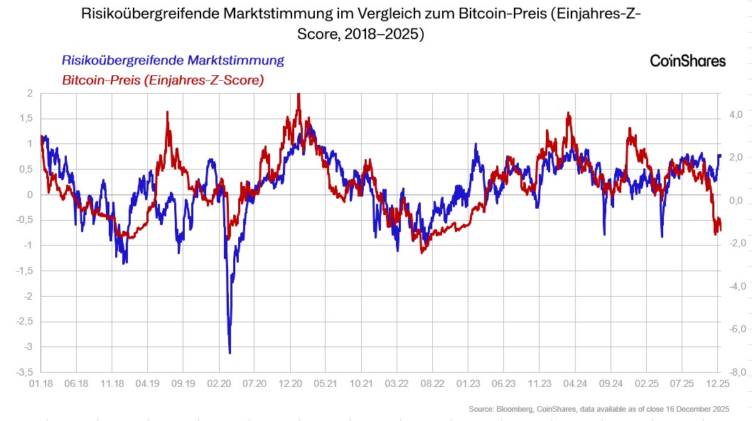 Aus makroökonomischer Bewertungsperspektive erscheint Bitcoin weiterhin unterbewertet, wie die beigefügte Grafik zeigt. Unser risikoübergreifender Stimmungsindikator fasst Daten aus allen globalen Anlageklassen zusammen. Er ging im November nur leicht zurück und erholte sich im Dezember deutlich, obwohl die Bitcoin-Preise fielen und auf niedrigem Niveau verharrten. Makromodelle, die die Preisentwicklung von Bitcoin anhand zentraler makroökonomischer Faktoren erklären, zeigen einen starken Anstieg der Residuen. Dies deutet darauf hin, dass die aktuelle Schwäche nicht mit dem makroökonomischen Umfeld zusammenhängt.