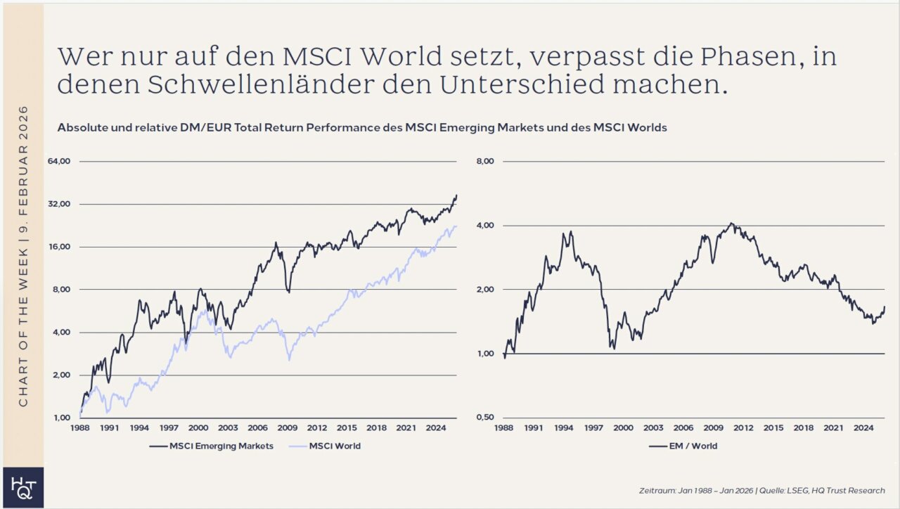 Um die Konsequenzen dieser Auslassung zu verdeutlichen, vergleicht Pascal Kielkopf, Kapitalmarktanalyst bei HQ Trust, die Wertentwicklung des MSCI World mit jener des MSCI Emerging Markets seit dessen Auflage Anfang 1988. Die Untersuchung basiert auf Total-Return-Daten in DM beziehungsweise Euro und deckt damit fast vier Jahrzehnte Kapitalmarktgeschichte ab.